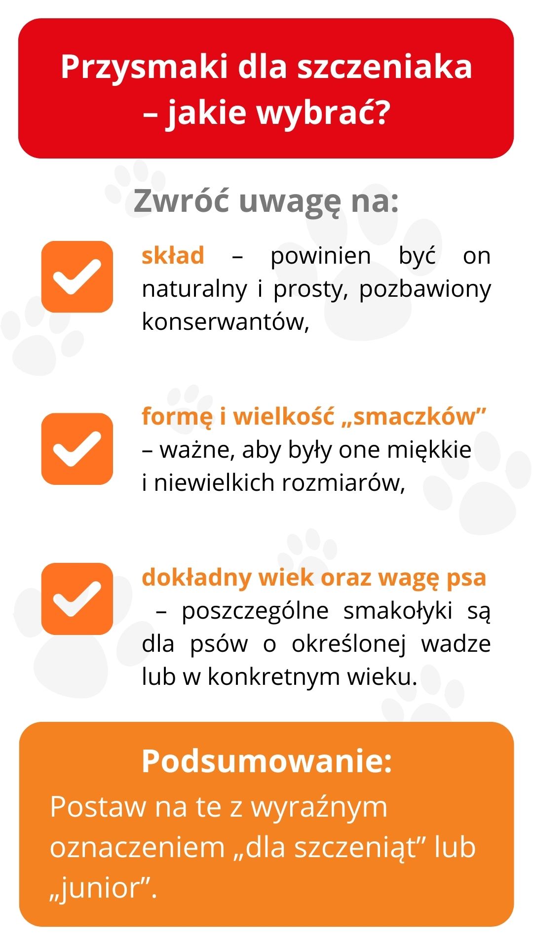 Opiekunowie szczeniąt powinni pamiętać o tym, aby nigdy nie podawać im przysmaków przeznaczonych dla ludzi. Są one zazwyczaj pełne przypraw, sztucznych substancji i konserwantów, a te mogą być dla młodego – i nie tylko – psa bardzo szkodliwe. Chcąc pochwalić swojego małego pupila za prawidłowo wykonaną komendę, najlepiej zawsze sięgać po sprawdzone smaczki przeznaczone dla szczeniaków.