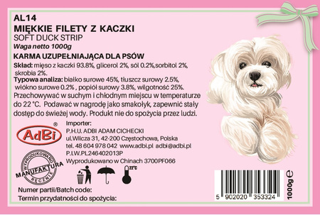 - Skład: mięso z kaczki 93.8%, glicerol 2%, sorbitol 2%, sól 0.2%, skrobia 2%.